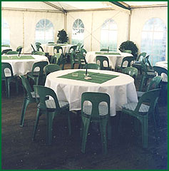 Tische: </strong>1,50 m Durchmesser, Damasttischdecken,